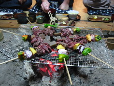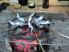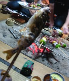 | 囲炉裏で焼く魚達 | まず初めに出された一品たち | お肉も盛りだくさん |