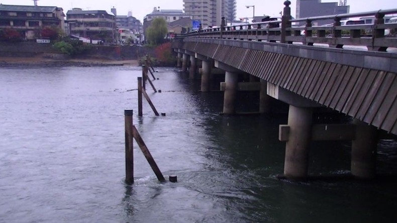 現在の橋は平成8(1996)年に架け替えられた、およそ20代目のものだそうだ。ト形の水切杭が急流から橋脚を護っている。