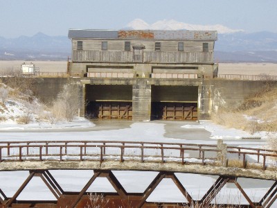 | 昭和5年1930年に完成した岩保木水門はもう古くなり、現在は2代目の岩保木水門が作られました。 旧水門 雪を被った山は阿寒連山です。 |