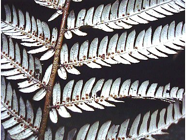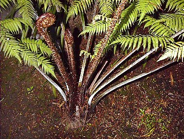 胞子はヘゴのそれのように付いている。ワイトモ石灰岩洞窟入口で。