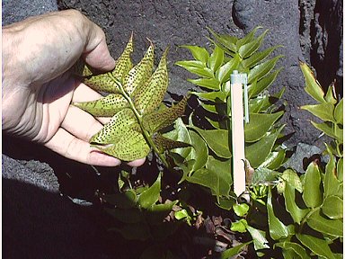 溶岩がゴロゴロした道をさらに降りていくと、崖の窪地にヒメオニヤブソテツが