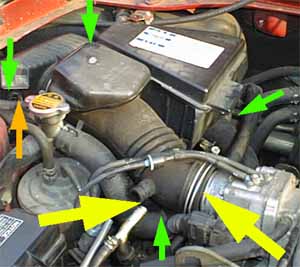 NAのエアクリは、エンジンの左側、プラスチックの箱(レゾネータ)が沢山くっついてるあたりの下にあります。エアクリBOXの上側は、レゾネータと、スロットルバルブまでのパイピングとが一体化していて、これを全部外さないと抜けません。ターボは、レゾネータが無いので、パイピングを外さず、隙間からフィルタを押し込むこともできるそうですが、NAはスロットルのパイピングだけでなく、吸気温センサ、リアサスペンション・アッパーブレス(タワーバー)なんかも外さねばなりません。もちろん、エンジンフード・サイドパネルも外します。特にタワーバーは結構しっかりとネジが止まっているので、ちゃんとした工具が無いと外せません。 まず、エンジンフード・サイドパネル(+ドライバ3カ所)を外し、リアサスペンション・アッパーブレス(14mmレンチ)を外します。これで、エアクリ周辺の邪魔者が完全に無くなって作業しやすくなります。次は、エアクリBOXのクリップ(右の写真の緑の矢印付近)を4カ所外します。そして、エアクリBOXに付いている吸気温度センサのコネクタ(オレンジの矢印)を抜きます。つぎは、ぶっといパイピングから枝分かれしているホース(クリップ)を外し、スロットル・バルブとの太いパイピング(+ドライバ)を外しながら、エアクリBOXをずらして行きます。パイピング(黄色い矢印)が完全に抜けたら、レゾネータやらパイピングやらエアクリBOXの上蓋ごと外れます。これで、中からフィルタを見ることができるようになりました。フィルタは、下側が吸気側です。ですから、フィルタの上側は比較的綺麗なハズです。 |