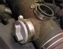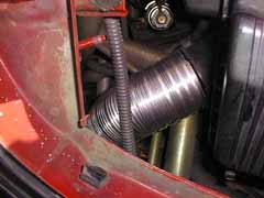 | 仮設で繋いでみた様子 実は、エアクリBOXとパイプの接続が 結構難しい。エアクリBOXとアルミパイプの 外径はどちらも同じなので差し込めない(^^;) 現在はビニールテープで貼り付けてある。 |