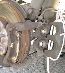 | キャリパーは落ちないように吊しておく ネジを2本外すと、キャリパーは下に落ちてしまいます。 キャリパーにはブレーキラインが繋がっているので、これにストレスを 与えないように何かで吊しておきます。 できれば、丈夫なフックでサスのバネに引っかけておくと良いですね。 今回は何も無かったので、ロープで吊しましたが面倒です。 交換は、パッドについたバネを外し、パッドを斜めに傾けるようにすると 簡単に外れます。パッドの裏には鉄板(シム)が2枚付いているので 付き方を忘れずに覚えておきます。 |