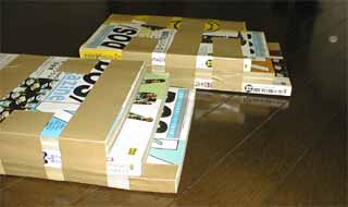 後輪を何かに乗り上げて・・・ と言っても、そんな都合の良いものは、なかなか有りません。ジャッキアップも地面が未舗装では危険です。そこで、要らなくなった厚手の雑誌の上に乗り上げてみました。使ったのは古いDOS/Vマガジン、3冊で1組みにし、ガムテープで、少しずらして束ねます。あとは、これを後輪にはめて乗り上げます。後輪のタイヤ幅とほぼ同寸なので、行き過ぎたり、横にはみ出したりしないように微妙なアクセルワークが必要です(^^;)