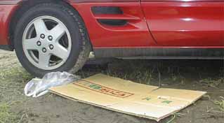 作業場所を探すリアを10cmくらい持ち上げられれば作業は可能です。そこで、実家の庭先の敷石ならぬ敷ブロックに乗り上げて作業してみることにしました。雨の後だっただめ、庭が泥だらけだったので、ビニールシートを引いての作業となりました。車の横に寝そべっての作業ですが、案外作業環境は良かったです。要は車が10cmくらい上がれば良いので、歩道に乗り上げるとか、ブロックを買ってくるとか、色々手だてはありそうです。注意点としては、車を持ち上げたとき、オイルパンからオイルが流れるような傾きになっていることを確認しましょう。リアをあまり持ち上げると、オイルパンの底にオイルが残ってしまいます。 |