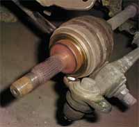 | ナックルを外して、ベアリングの様子を調べてみることにした。ドライブシャフトのナットを外した時の様子が左の写真。ハブのスプラインに比べ、ドライブシャフトが少しひっこんでいる感じ。この分ハブが手前に浮いてしまったのだろうか? ナックルを外してみたが、ベアリングに軸方向のガタは無かった。ずれた状態で固定(固着)されているのか、ベアリングのボールかカラーのガイド部がすり減っているか、どちらかなのかもしれない。ただ、ベアリングを裏から見た感じでは、軸方向にずれた形跡が無いので、すり減ったか割れた可能性が大きそうに思える。ナックルを外す様子は上で紹介している。 |