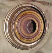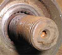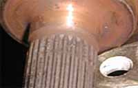 | 気になるのは、ドライブシャフトのスプラインに残ったキズの後。左の写真がそうなのだが、ちょっと不鮮明だけど、スプラインの根元から1cm?くらいの処にスジが見える。ハブ側のスプラインは根元までスプラインが切ってないので、このへんに後が残ってしまう可能性が無いとは言えないのだけど、これにひっかかってハブが横にずれてしまう原因を作っている可能性も否めない。 どっちにしても、ハブベアリング自体にガタがあることは確認できた。ベアリングが死んでいることは明確になった。 |