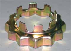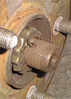 上の写真は、右のロックキャップの様子。全体的にロックキャップをひっかける為のデコボコがなぎ倒されているが、特に手前の半周分はデコボコが引きちぎられたり、ぺちゃんこになるまで押しつぶされている。コッターピンが、ロックキャップ自体に当たって、ロックキャップが回らなくなり止まっているようだ。つまり、コッターピンのおかげで、ホイールが外れずに済んでいるわけだ!! でも、きっと、これも時間の問題だろう・・・