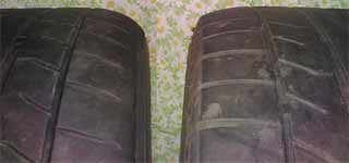 | フロントタイヤに使用していた、使用済みのGRID2(195/55R15)の様子です。 上の写真は、右側がアウト側、左側がイン側で右がボロボロなのに比べて、左のミゾは、まだしっかりしています。真ん中より右側(アウト)のブロックの摩耗が激しいです。ミゾの残りは、外側の浅い処で1mm、内側の深い処で4mm程度と偏摩耗しています。 下の写真は、右がイン側、左がアウト側になるように左右のタイヤを並べた様子です。これをみると、サイドエッジが完全に無くなっているのが直ぐに分かります。この差は、指で押しても剛性の違いを感じることができます。すり減ったほうはペコペコで恐らくタイヤのどの部分より柔らかいです。これじゃあ、タイムは出ませんよね・・・ 写真では分かりにくいですが、左右どちら側のブロックも、外側のミゾが浅く、内側のミゾが深くなっています。これは、フェザーエッジ摩耗とか、トーイン摩耗、トーアウト摩耗と呼ばれている現象です。過度なトーイン(トーアウト)のまま、タイヤを引きずって走った時に起きるようですが、もちろんこれはサーキット走行によるものです。 このタイヤはフロントですから、アンダーを沢山だしたことが明白に分かります(^^;) 自分では、ゴリゴリ鳴るほどのアンダーでのコーナリングは極力控えてきたつもりでしたが、コーナーからの立ち上がりで、ハンドル戻す前から、かなりアクセル踏み込んでアンダー出している癖があるので、そのためかもしれません。あと、定常円旋回で、無理矢理アンダで加速し、タックインでリアを振り出すことをしていたので、これも災いしているかもしれません。ちなみに、使用期間は約2年、走行距離は1万km強、サーキット(ジムカ含)を20回以上走ってます。 新しく購入したネオバは、左右組み替えができないタイヤですから、こんなにならないように気遣わないとなりませんね。でも、先日の走行で、リアは結構削れたあとがありました。極力オーバー出さないように走ったつもりだったのですが、後半、空気圧が上がりすぎグリップ落ちたときにオーバー気味になったくらいかな? タイヤを酷使しすぎて溶けて偏摩耗してしまうのかな? |