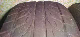 | 購入時に履いてたタイヤです。もう、すでに新品の販売はされていないでしょうが、中古市場では時折見かけます。私が手にしたときには、すでに4〜5部山程度で、若干内減りしてましたので、このタイヤの旬はすでに終わっていたと思います。でも、その当時の自分には十分すぎるグリップでした。公道では、まず限界を出せません。それから数回、山の中を走っていると、だんだんタイヤがロックしたり、流れたりするようになってきました。ただ、これは車に慣れて、少し扱えるようになっただけかもしれません(^^;) そのうち、ジムカーナで振り回せる機会があり、リアのスライドを試みました。相当思い切り加減速を繰り返したせいか、ほとんど初心者のような私にでも、結構簡単にブレークするようになりました。ただ、挙動は急にくるように思えます。このときにリアはすでに2〜3部山で、コンパウンドも堅くなり、限界は低くなり、さらに挙動も唐突になってきたのではないかと思います。 最後は、スリップまで、あと0.5mm以下と、場所によってはスリップが見えてる0〜1部山状態で、雨の筑波サーキットを走りスピンしまくったため、このタイヤにはサジを投げてファルケンGRβRStuneに履き替えることとなりました。(ホントはサーキット走行前にタイヤ交換したかったが納期が間に合わなかった) |