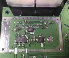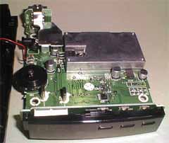 赤外線LEDの明かりで距離を検知するというのは、ちょっと面白そうだったので、分解してみました(^^;) 左の写真でいうと、左下の黒いパネルが赤外線LEDが隠れている場所で、右側がレンズです。光センサが金属ダイキャストのケースに隣接しています。きっと、微弱な赤外線を検知し、めいっぱい感度を上げて検出しているのでしょう・・・ 中身はOPアンプのかたまりのようです。これだけご大層なシールドケースに納める必要があるかは不明ですが、実は、単なるヒートシンク代わりなのかもしれません(笑)