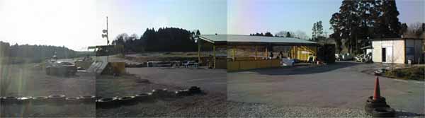 INからコースイン、OUTからコースアウトできます。OUTとINの間には、カート用のピットがありますが、四輪はコース外へ出てしまう感じになります。コース長は580m、幅は6〜11mですが、車が1台だけで走るには十分な道幅があります。ただ、コースの外は、盛り土だったり、スポンジバリアーだったりと、コースアウトしてしまうと車がクラッシュしてしまう可能性も大きいので、限界まで攻めるのは、なかなか怖くてできないかもしれません。また、コース状態は結構荒れていて、田舎の一般道並です(^^;) おまけに、ダストが浮いていて結構滑ります。サイドを引く練習には良いところかも? (笑)