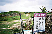 ![]() | これだけはっきり「遊泳禁止!!」と看板が立っている横の有刺鉄線を乗り越え、浜まで降りる道を歩いていく。普段は牛の天国なので、辺りは糞ばかりである。 ちなみに、有刺鉄線を乗り越える時に、左の膝の辺りを引っ掻いてしまった。 |