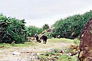 ![]() | 浜まで降りるには、急な坂道を下って行かなければならない。しばらく坂を下って行くと、牛が数頭道にたむろし、こちらに向かって「ガンタレ」ていた。こうなれば、もう「蛇に睨まれた蛙」である。ここは素直に引き返す事にする。牛怖いよ。ホントに。 |