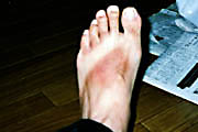![]() | 自宅に戻ってきてから撮影した、筆者の足の甲。与那国島や波照間島で出歩いていた時に履いていた草履の鼻緒の跡が、クッキリと付いてしまった。普段日焼けしない場所なので、このあと大変なかゆみに襲われ、難儀な状態になってしまったのだ。 |