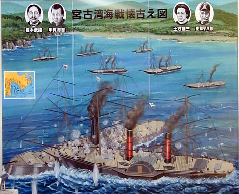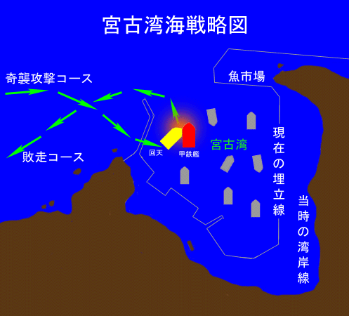 | 宮古湾海戦の目的は、北海道の江刺沖で座礁し失われた旧幕府軍の旗艦「開陽」の損失を補うため、当時、新政府軍の最新鋭艦であった「甲鉄」を分捕ろうという作戦の決行にあった。甲鉄は元々幕府が米国から購入するはずの船だったが、大政奉還により、すでに新政府軍に所有権が移っていた。当時「回天」の艦長だった甲賀源吾は、フランス海軍のニコール少尉の進言もあり、奇襲(アボルダージュ・ボールディング)によるフランス軍敵艦切り込み戦術(船による接舷)を採択した。そこで榎本艦隊は、土方歳三が乗艦した「回天」を中心に、蟠龍(ばんりゅう)高雄(たかお)を従えて、函館を出航し、新政府軍艦隊が碇泊する宮古湾(岩手県宮古市)を目指す。ところが南下の途中、暴風雨や機関の故障により、三艦はバラバラに離散してしまう。最初の決行は、「高雄」が「甲鉄」に接舷し、白兵戦を持って、船を乗っ取る作戦の予定だったが、やむをえず「回天」がその任務を担うこととなった。だが回天は両舷の大きな外輪で推進する外輪船であり、さらに目的の「甲鉄」は、装甲板の自重により船が沈み、普通の船より甲板がかなり低い船だった。結局、「回天」は艦首から「甲鉄」の左舷へ突っ込む形となり、高低さも省みず数名が飛び込み白兵戦を試みるが、銃器で反撃され、狙い撃ちにあう。その結果艦長の甲賀源吾を初め、大勢の死傷者を出すことになる。回天が「甲鉄」の奇襲を開始したのは、明治2年3月25日の早朝、午前5時のことであり、わずか30分の戦闘で勝敗がついた。その後「回天」はすぐに離脱し、宮古湾を撤退している。 |