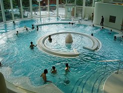 ![]() ■印象 大きなバーデプールの北側の壁はガラスになっていて、森のような大きな庭が見える。外に出ると真湯と温泉の2種のジャグジーがある。ぬるめなので、ゆっくり浸かっていられる。 ジャグジーはなかなか気に入った。都会であることを忘れて、森の中でくつろいでいる気分になれる。ぴったり寄り添っているカップルも多い。 ![]() 裸ゾーンの浴室からも森の木がよく見える。主浴槽はずいぶん大きい。ハッキリした黄色で、強食塩泉らしい重たいお湯だ。ほんのわずかキシキシ感がある。残念ながらわずかにカルキ臭がする。 泉質はナトリウム−塩化物、源泉の温度33.8℃、成分総計20.5g/kg、(深深度ボーリング1445m)。 温泉を楽しむという観点では物足りないが、ジャグジーでのんびりするデート用の温浴施設としてはなかなかすばらしい。 他の遊園地の温泉施設よりも好印象だった。 |