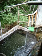打たせ湯から階段を上ると混浴の露天風呂だ。広い浴槽の中央に大きな岩が置いてある。ここもざばざばとかけ流しだ。 女性浴室と離れているので、露天風呂の近くに女性専用脱衣所がある。