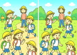 この「友達トランプ」は、お昼休みなどにクラスの子どもたちと先生が一緒に遊ぶババ抜き用のトランプです。 (使い方) ババは先生の顔写真カードを使います。仮にクラスに6人のお子さんがいて先生が2人でしたら、8セット分の友達の写真カードを用意します。下の子どもたちのイラストや教員の写真がカードになりますが、実際はイラストではなくて子どもたちの顔写真をカードにします。 何故、お子さん達の顔写真をカードにするかというと、小学部や中学部のお子さん達は、クラスの友達の名前は徐々に覚えてくれますが、同じ学年でも隣のクラスやその隣のクラスの子のことは知らないということが結構あります。「友達トランプ」は、クラスの友達だけでなく学年の友達や先生方にも興味を持ってもらうのが目的になります。 ババ抜きですから、手元に同じ友達のカードが来たら2枚を捨てていきます。先生のババカードが最後まで残った子が負けになります。遊びながら、先生の名前や顔や友達の名前を覚えてくれ、興味を持ってくれたらいいですね。 |