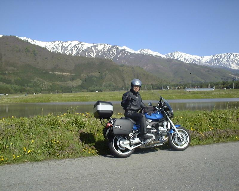 [ギャラリーのトップ] [前] [次]はじめまして、まーくんと申します。自分で言うと照れます。R1100R を購入して約1年です。以前は国産ハイパワーマシンに乗って いたのですが、バイクショップで一目惚れ!毎日ショップに寄 っては眺め、購入を決断しました。この写真は、白馬で撮った ものです。5月6日ですが、まだまだ山には残雪が、そして道 路脇には綺麗な花が、なんだかヨーロッパみたいでこの写真が 好きです。バイクは、夏仕様、冬仕様があり、これはエアロフ ローのスクリーンを付けた冬仕様です。夏はドーケンのビキニ カウルを付けて使い分けしています。こんなバイク見ましたら ピースサインよろしくお願いします。
