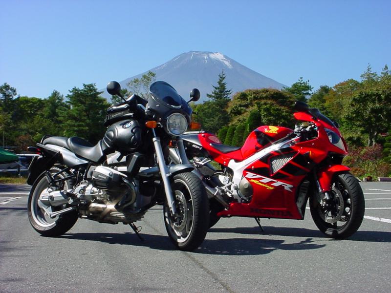 初めまして。充実したページいつも楽しみにしています。この写真は,山中湖付 近に行ったときのものです。秋晴れのすがすがしい日(10月12日)でした。 2台を乗り比べましたが,R1100RはVTR-SP1に比べるとなんとのんびりしている ことか…。性格まで穏やかになるような気がします。どちらも個性豊かなバイク です。紅葉まであとわずか。寒いだろうけれど楽しみな季節です。 Rより