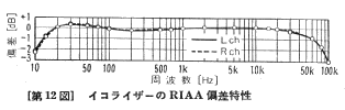イコライザーのRIAA偏差特性を図12に示します。超低域では減衰させ、可聴帯域内では±0.5dB以内に入れています。イコライザー部の歪率特性を図13に示します。グラフから分かるように、イコライザー部は最大出力電圧が大きいため許容入力には十分余裕があります。最大出力を80Vとして約800mV(1kHz)の許容入力です。特にNF−CR型の特徴として、低域から高域まで歪率特性のカーブに殆ど違いのない点は注目に値すると思います。高域で歪み率のカーブに段がついているのは、前段と後段のユニットアンプ双方の歪が干渉しているためで、さらに周波数が高くなると前段が先に歪むようになります。残留雑音の主成分は低域のフリッカーで、イコライザーアンプの入力換算雑音はJIS−A補正で−118dBV程度と十分小さい値です。