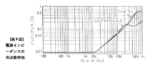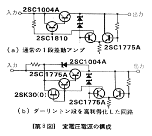電源を設計する上で重要なのは出力インピーダンス特性です。直流のインピーダンスが低いだけでなく、周波数特性もよい必要があります。インピーダンスが十分に低ければ、当然リップルも少なくなっているはずです。本機では、電源のインピーダンスを重視して、イコライザー段まで一つの定電圧電源で直接駆動することにしました。従って電源に対する要求は当然厳しくなるわけですが、それでも直流でのインピーダンスを0.1Ω程度まで下げれば十分のようです。ゲインを大きく取るために、増幅段をOPアンプで構成する例もありますが、周波数特性の点からは図8(1)に示すような1段アンプが良く、この構成でいかにして利得を稼ぐかを考える方がよい結果が得られます。今回は200Vの電源が必要なのですが、高耐圧のTrはhfeが低く、ダーリントン段で利得を稼げないので、(2)に示すような回路を考案しました。こうするとhfeの高いTrを前段に使うことができます。高域特性を良くするには分割抵抗を低くし、差動増幅段をカスコード接続にすると良いのですが、それよりも配線のインダクタンス分による高域のインピーダンス上昇が大きいのでそこまではやりませんでした。もしそこまで性能を追求するならば、電源からの配線法に一工夫必要でしょう。出力側には、100k〜1MHz領域のインピーダンスを下げるためと、各ユニットアンプ間の干渉を少なくする意味でコンデンサーを入れてあります(図9参照)。また各ユニットアンプの基板にも、コンデンサーを載せています。コンデンサーは共振周波数の異なるものをいくつか組み合わせれば一般品でも十分よい結果が得られます。当然のことですが、各ユニットアンプへは電源の出力点から別々に配線しないと、干渉が起きます。