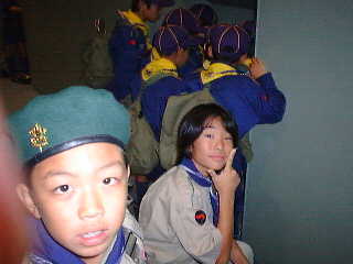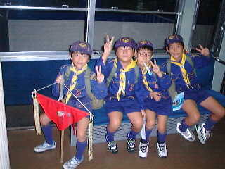 ポーズをとるデンコーチ、クイズゲームで遊ぶカブスカウトたち