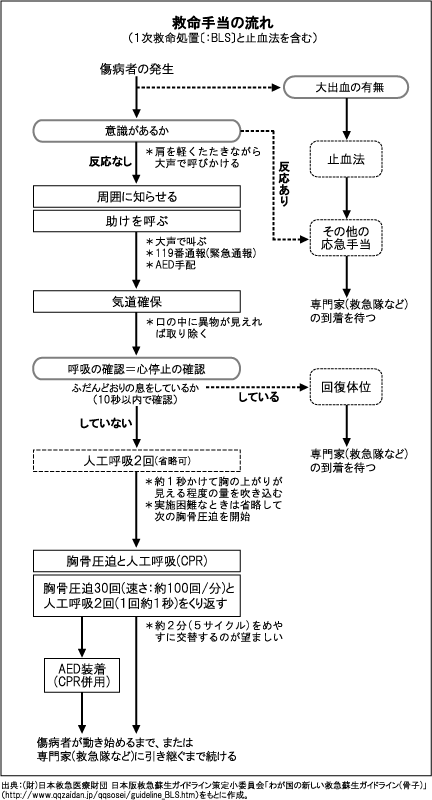 日本版救急蘇生ガイドラインの内容を組み入れた救命手当の流れ図。従来にくらべ観察の項目が簡略化され、できるだけ早期に胸骨圧迫を開始し、強く・速く・絶え間なく行うことを推奨する内容になった。(AED装着後の部分は省略)