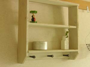 キャビネットを作った残りの木材で作成。 白いペンキはラフに塗ってやすりがけもして、所々剥げたようなカンジにしています。 フックは むか〜〜し使っていたエスニックなカンジの壁掛けから取って付けました。