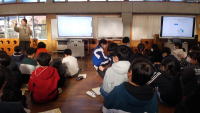 ◎ 久喜小4年生総合的学習の時間 提燈祭りについて 12/10(火) 10日午後から久喜小多目的室で「総合的学習の時間」でこの間取り組んできた研究発表があり参加しました。久喜小では子供たちがそれぞれ地域的課題に取り組んでいます。例えば 6年生は既に報告していますが、久喜市をホームタウンとする3X3のプロチーム「埼玉ワイ ルドベアーズ」をもう少し市民に知ってもらう、なじんでもらおうという活動です。8日「総合 体育館」で行われた「ワイルドペアーズ」の試合で、同チームの応援する歌を作詞作曲し、 選手諸君とコラバで出場したりしました。 5年生は「久喜クッキーキ」とか、「提燈サブレ」とか久喜特産の食べ物等の宣伝に取り組んでいるそうです。そして4年生 です。郷土の祭り「提燈祭り」の宣伝に取り組んでいます。理由は調べてみたら提燈祭りは、埼玉県内で知名度6だった事に びっくりしたそうです。(この6位という順位の出典は示されていません。私もこれには驚きました。) 当然1位でなければ ならない。世界文化遺産にも登録してもらおう、子ども達は考え、それが実現する様々な方策に取り組んだそうです。6年も 5年も4年生もそれぞれに地域に関心を持ち、地域の活性化に取り組んでもらっていること感謝します。地域と共にある 学校を目指す私たちとしては大歓迎、あらゆる協力を惜しみません。 この日この間子どもたちの授業にゲストティチャーとして参加したり、逆に子供たちが訪ねて行って質問したり、とにかく この間係した多くの祭り関係者が参加されました。祭典委員会副会長は祭り職人と紹介されていました。保存会会長が2人 仲町と本一の若者、八雲神社の氏子代表等々10名近くに上りました。 代表がこの間取り組んだ内容を発表しました。取り組んだ動機については前記しました。そのために広く市内外に提燈 祭りを広く知ってもらうことが1番と考えたそうです。そのためにちらしを作りました。祭りグッズも制作しました。意見を求め られましたがそのチラシの出来の良いのに驚きました。我が本二祭典保存会会長が来年会議や準備に着るTシャツを 作る予定です。そのデザインを君たちにお願いしますとの発言、皆大喜びでした。 とにかくみんなが熱心に取り組んでいることと、その出来栄えに感心しました。「共創の学び」とはこれをいうのだと実感 しました。 |