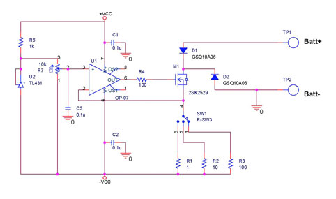 図1の負荷回路で電圧をずーっと20秒毎に記録しました。D1,D2は電池電圧がマイナスにならないための保護です。±12Vで動かします。実際にはTP1〜セルの+極の間に電流計を入れてあります。