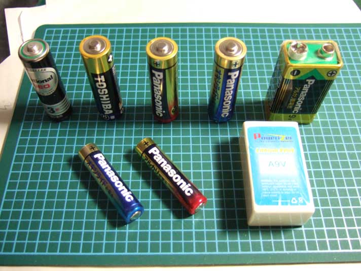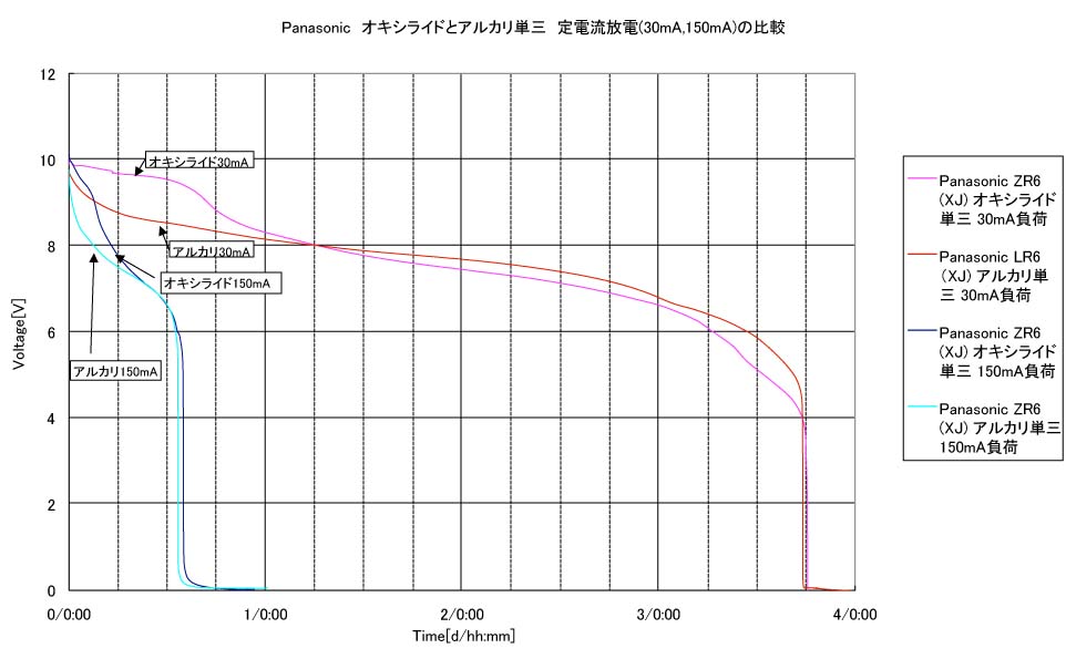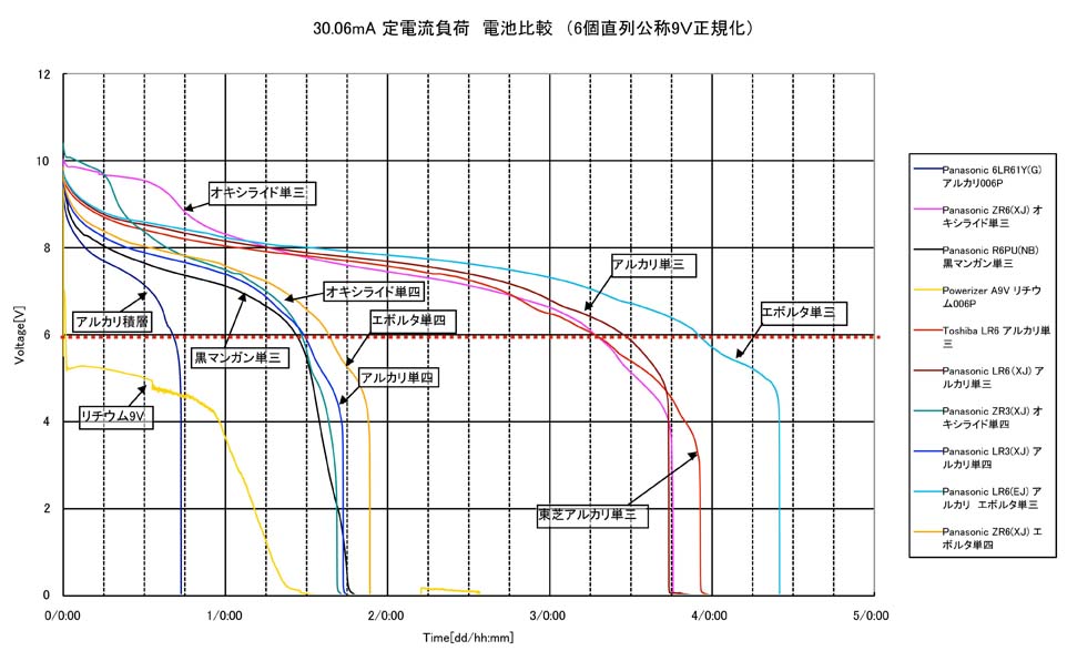 型名 種類 形状 期限 Panasonic 6LR61Y(G) アルカリ 006P 07-2007 Panasonic R6PU(NB) 黒マンガン 単三 10-2009 Powerizer A9V 塩化チオニルリチウム 006P 製造2007-1 Panasonic ZR6(XJ) オキシライド 単三 11-2012 Panasonic LR6(XJ) アルカリ 単三 10-2012 Toshiba LR6 アルカリ 単三 10-2012 Panasonic ZR3(XJ) オキシライド 単四 11-2012 Panasonic LR3(XJ) アルカリ 単四 11-2011 Panasonic EVOLTA LR6(EJ) エボルタ 単三 04-2018 Panasonic EVOLTA LR3(EJ) エボルタ 単四 04-2018 ※単三、単四電池は二個直列にて、9V系の電池は単体にて、電池の端子電圧が落ちる様子を測定