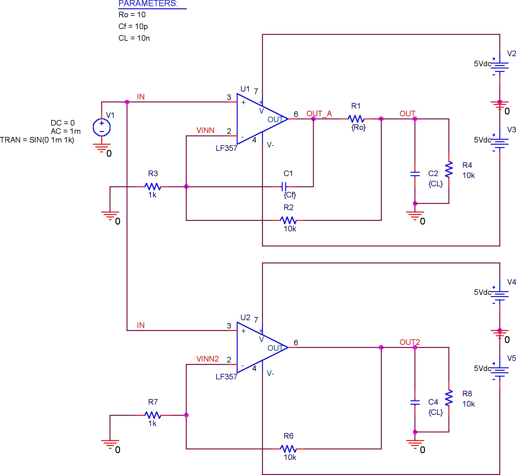 では、先に、よく間違えられる、容量負荷に対する位相補償の回路を考えてみます。LF357モデルで考えます。容量負荷CLによって位相余裕が無くなった状態を補償してみます。