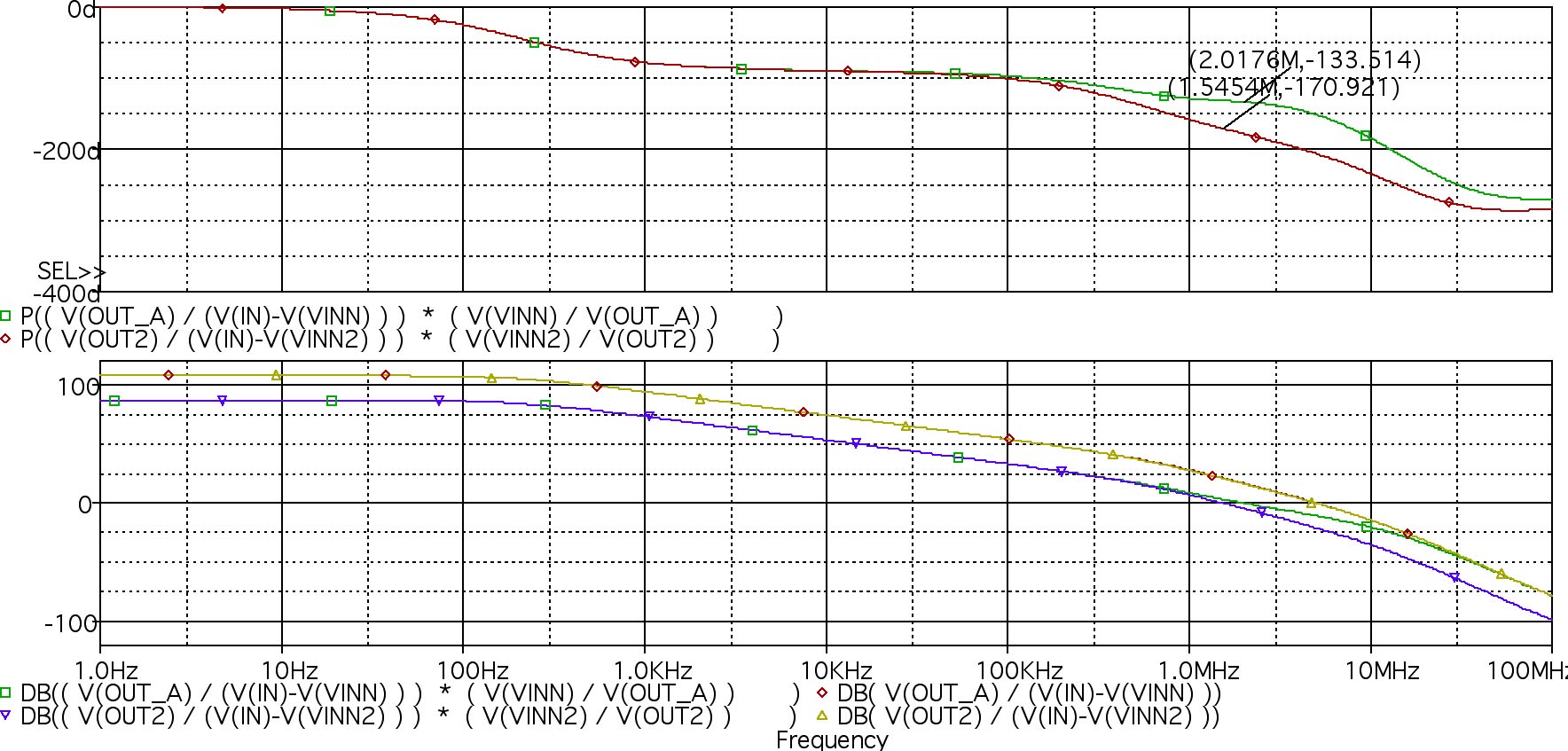 まず、上の回路でR1(RO)がほぼ0(0.01Ω)の場合。C1(CF)=10pFのみによって位相補正をします。すると図3のように、位相余裕が約8degであったのが補償後に46.5degに増えています。