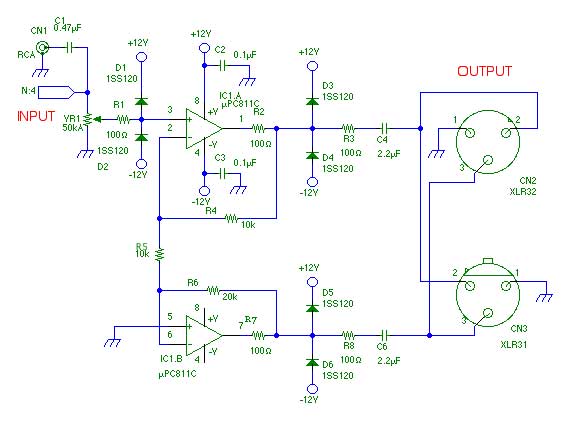 一般的なプロ用の機器をお持ちのかたとホールで遭遇したときのため、(たとえばプロのビデオやさん)、シングルを差動に変換し、かつレベルをプロ用に合わせられるように以下の回路を作って、できるだけ持っていくようにしています。DCマイクで録音する人間の義務とも考えられます。この変換アンプで何回か助かりました。レベル調整はその場でやるようにしています。プロ用規格がわかっていても、DCマイクのレベルが大きすぎるのでボリュームにしたほうがよいです。