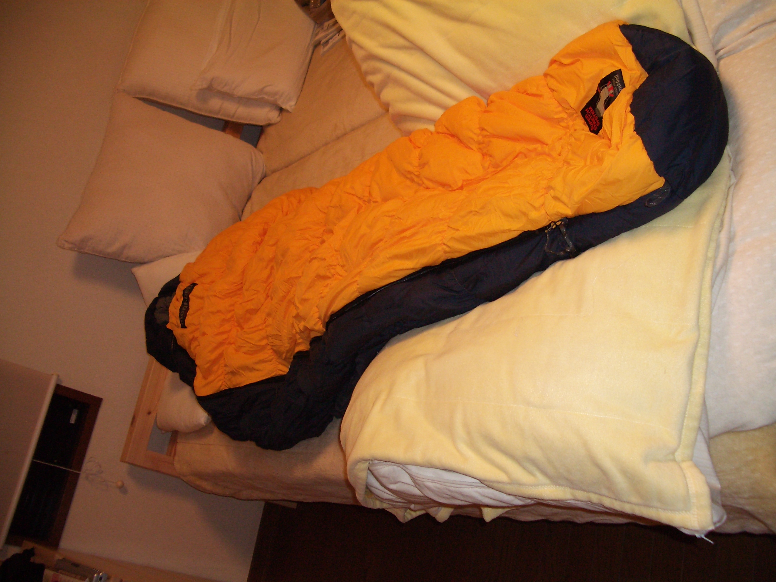 | <2代目シュラフ> スポーツオーソリティ製の封筒型シュラフ。 2つ購入。(安物です。) これを購入して、家族全員分の シュラフがそろいました。 |