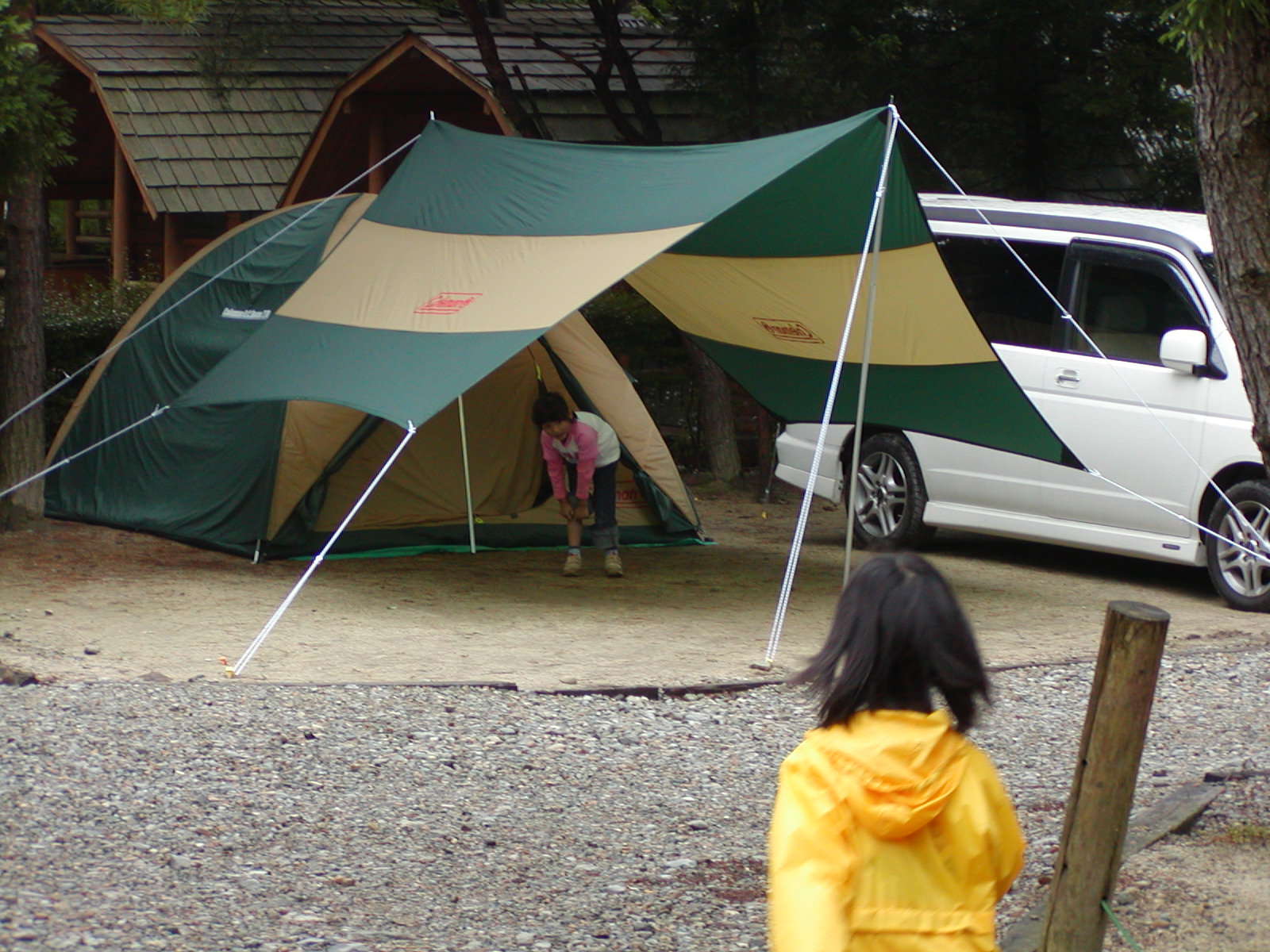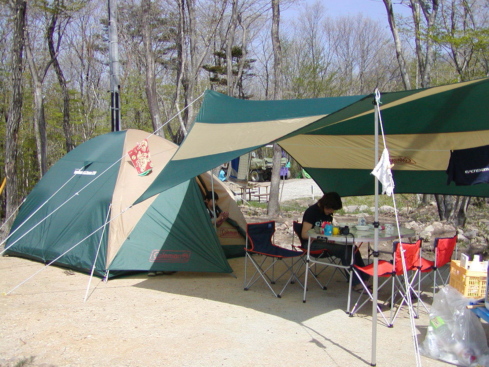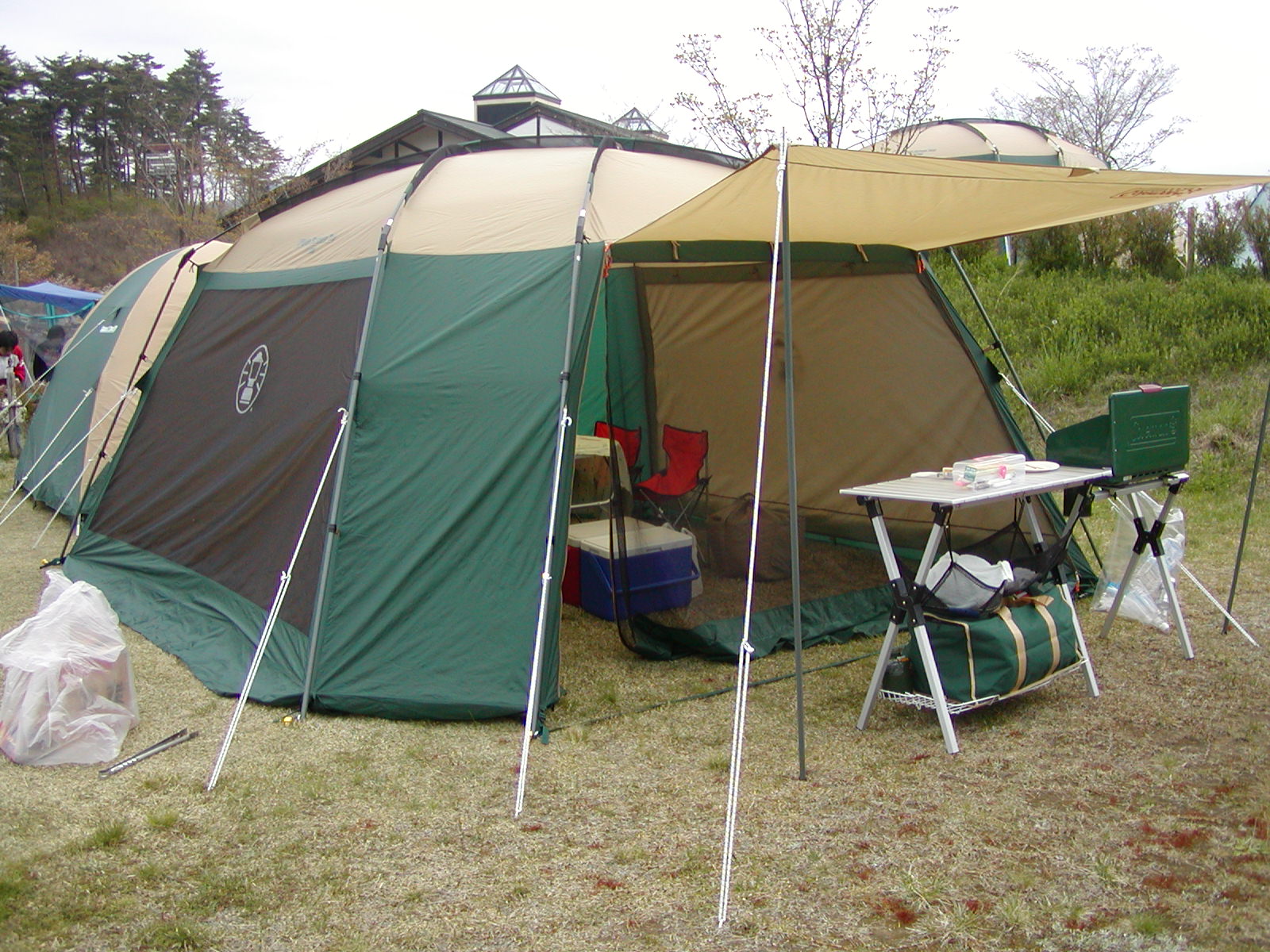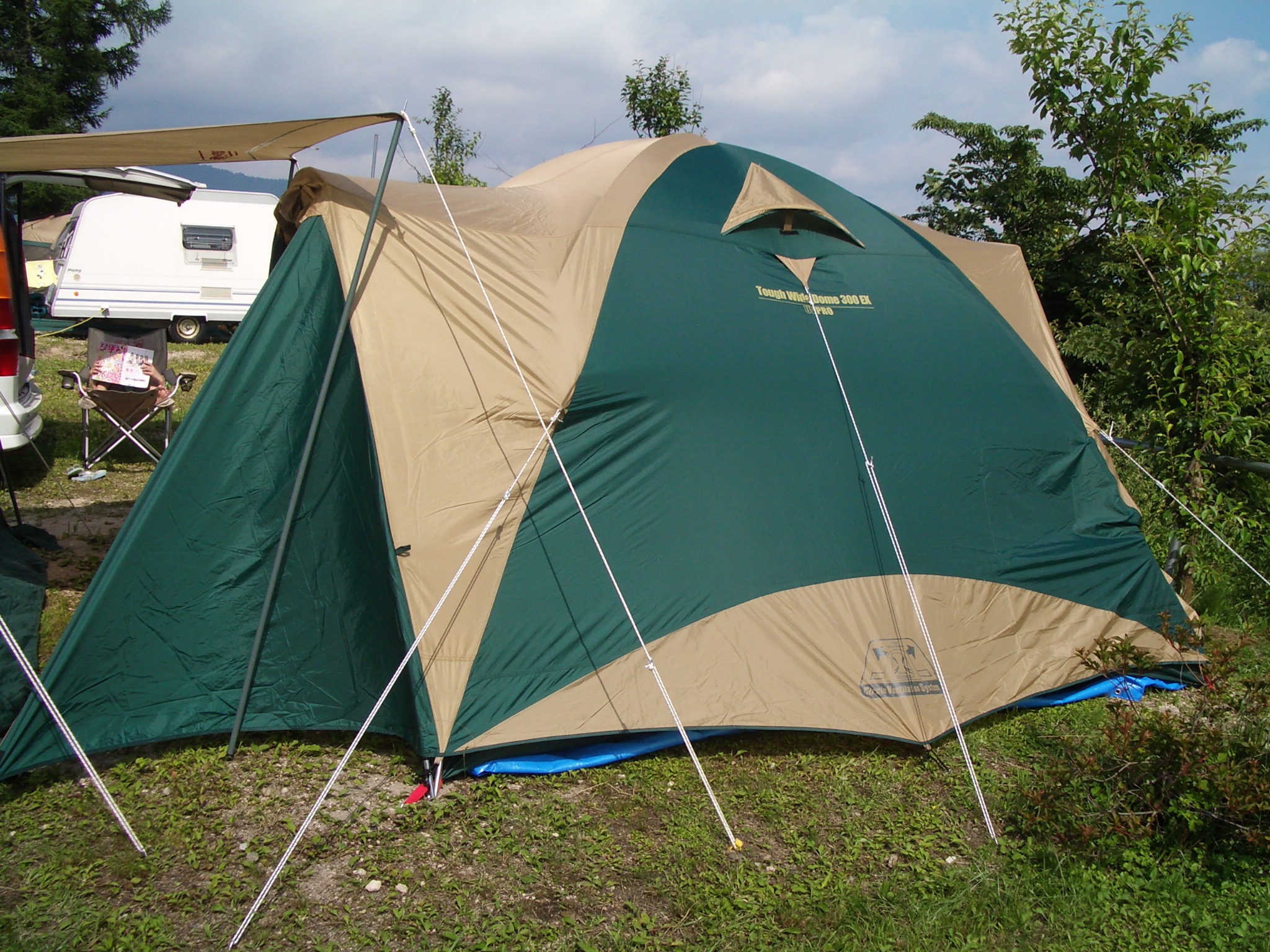 <初代テント> サイズが270×270で、 大人2人子供2人でちょうどのサイズ 約3年間お世話になったテント。 とうとう2005年暮れに 300EXへバトンタッチ!。 (狭くなっただけでまだまだ現役) |