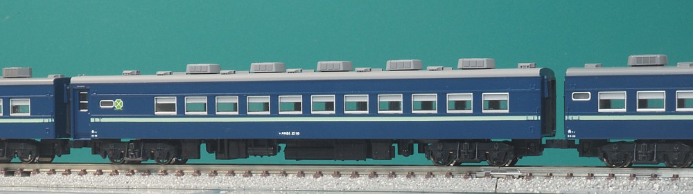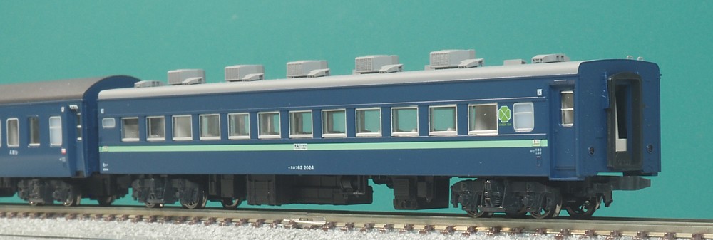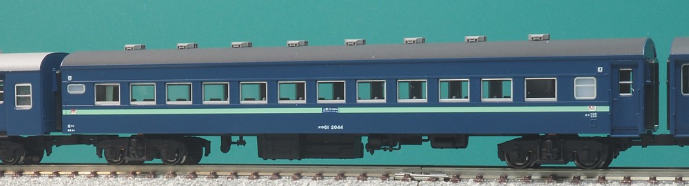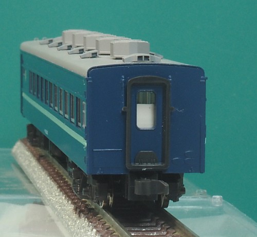 でオロ61です。 片方の扉は塞がれて便所・洗面台になりました。 新設された便所は洋式になっています。 便所・洗面台の窓はHゴム支持になりましたが、これは一部の車両では施工されなかったようです。 台車はTR52になり、窓はアルミサッシ化、ドアも軽量客車と同じ上段が開くタイプとなり外観は軽量客車風になりました。 水タンクは寝台車と同様、大型のものが装備されました。(模型では表現されていません)
