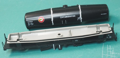 つまりタキ35000の車体を短縮すればできるので、レザーソーでがりがり車体を切断して長さを縮めます。 接合面はどうしても隙間ができてしまうためパテで埋めて整形。 サーフェーサーを塗ってキズを確かめているところです。