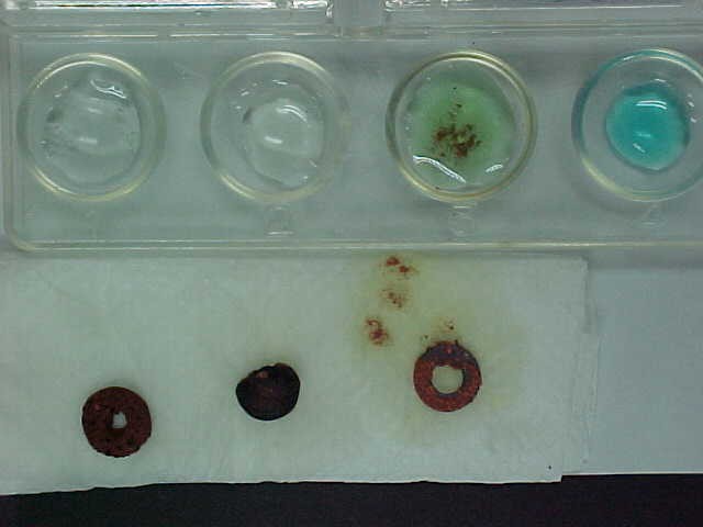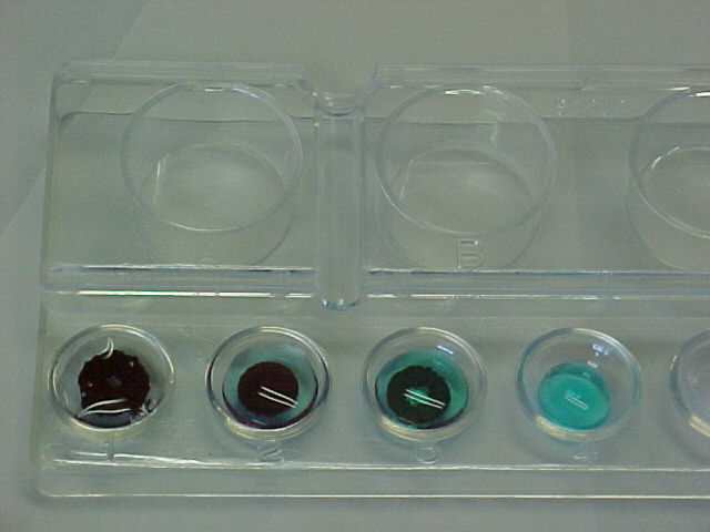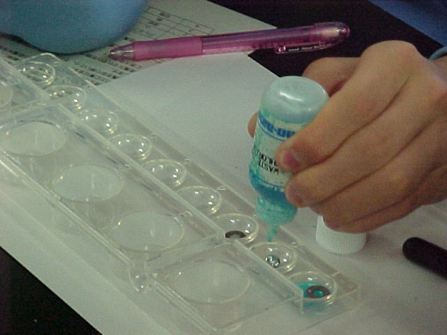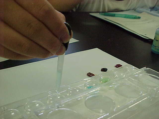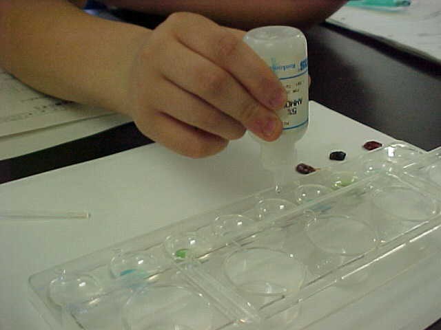塩化銅の水溶液をそれぞれの金属に入れているところ