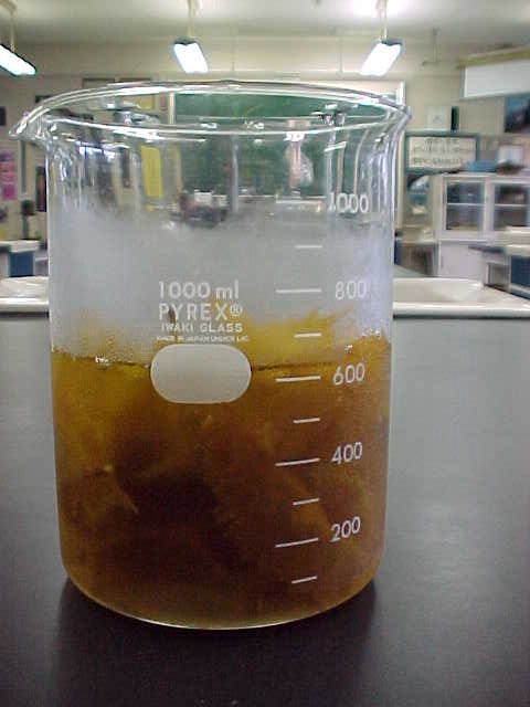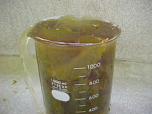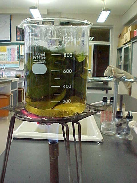 このぐらいのビーカーですと、いっぺんに50枚ぐらいは葉を煮るのが可能です。