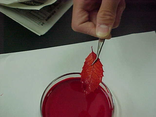 煮たビーカーから別のビーカーの中に、はしで葉を移して水で洗います。