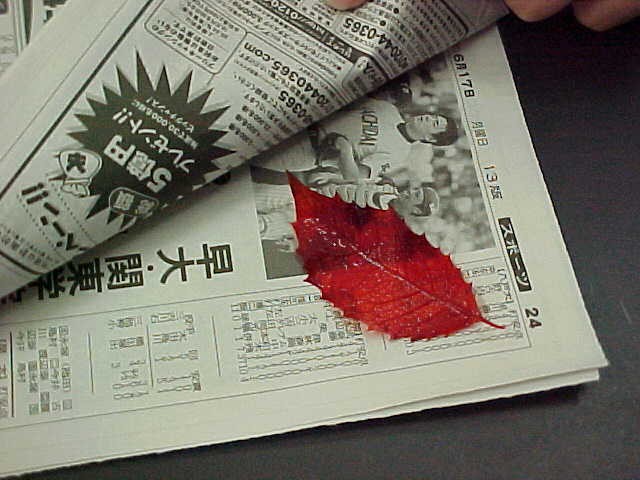 食紅の中に入れます 取り出して新聞紙にはさみます