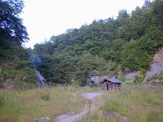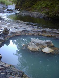 ホースでひかれている川の水で薄めて湯船が適温に保たれている。