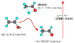 右の図では、酸素原子から離れた水素原子が、隣の炭素原子に移って行こうとする様子がわかります。同じく、結合相手の炭素の側も、近づいています。図示化するとわかりやすいですね。