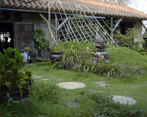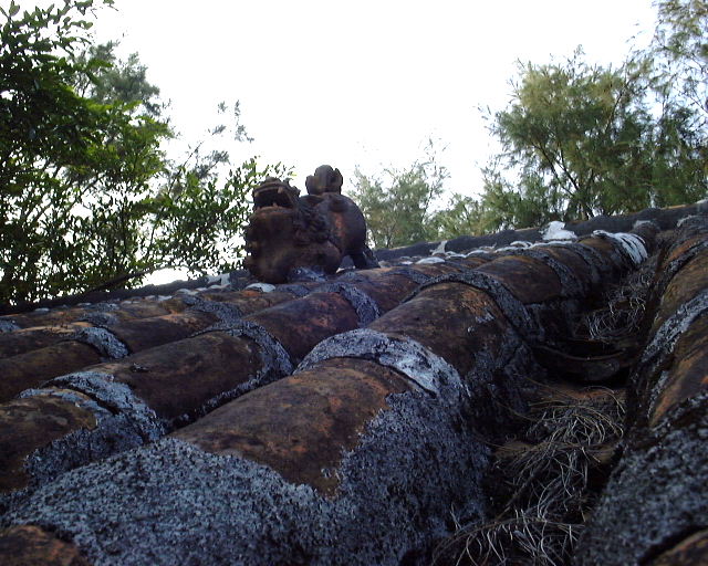 工房の赤瓦屋根に鎮座し天空を睨むシ−サ-