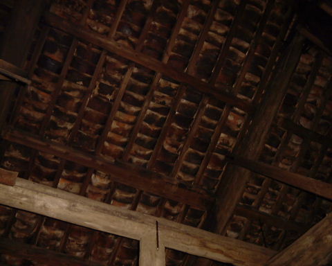 赤瓦剥き出し、屋内から見た屋根。下に囲炉裏があり煤で黒ずんでいる。