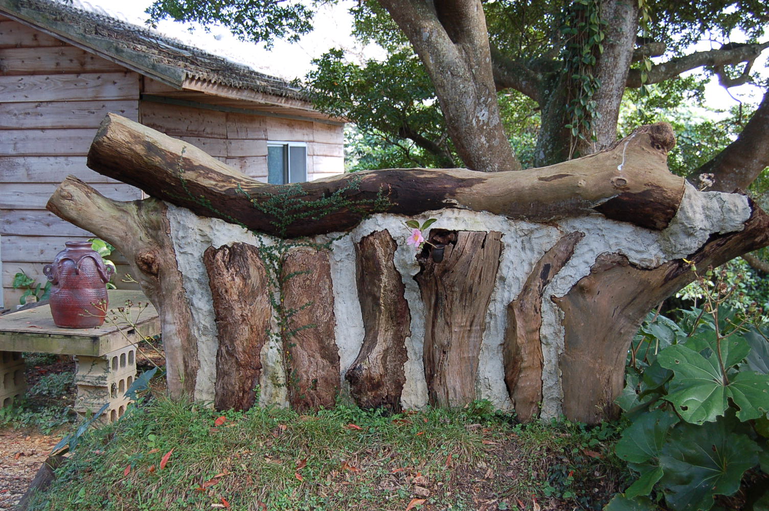 下方スイヒ場の側に植えたツバキが、毎年この時期に咲く。ホルトノキ前のヒンプンの朽ちた箇所に
